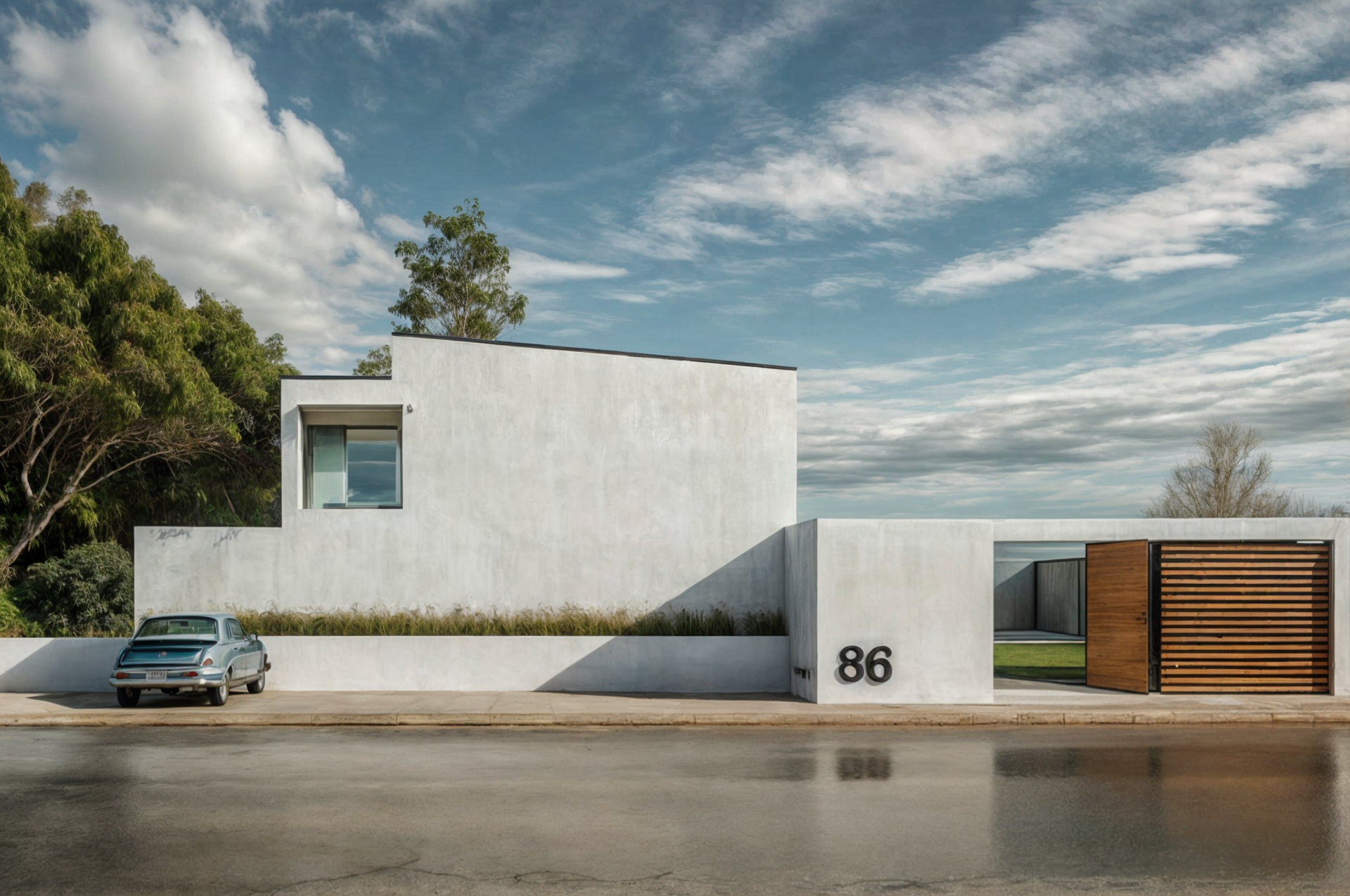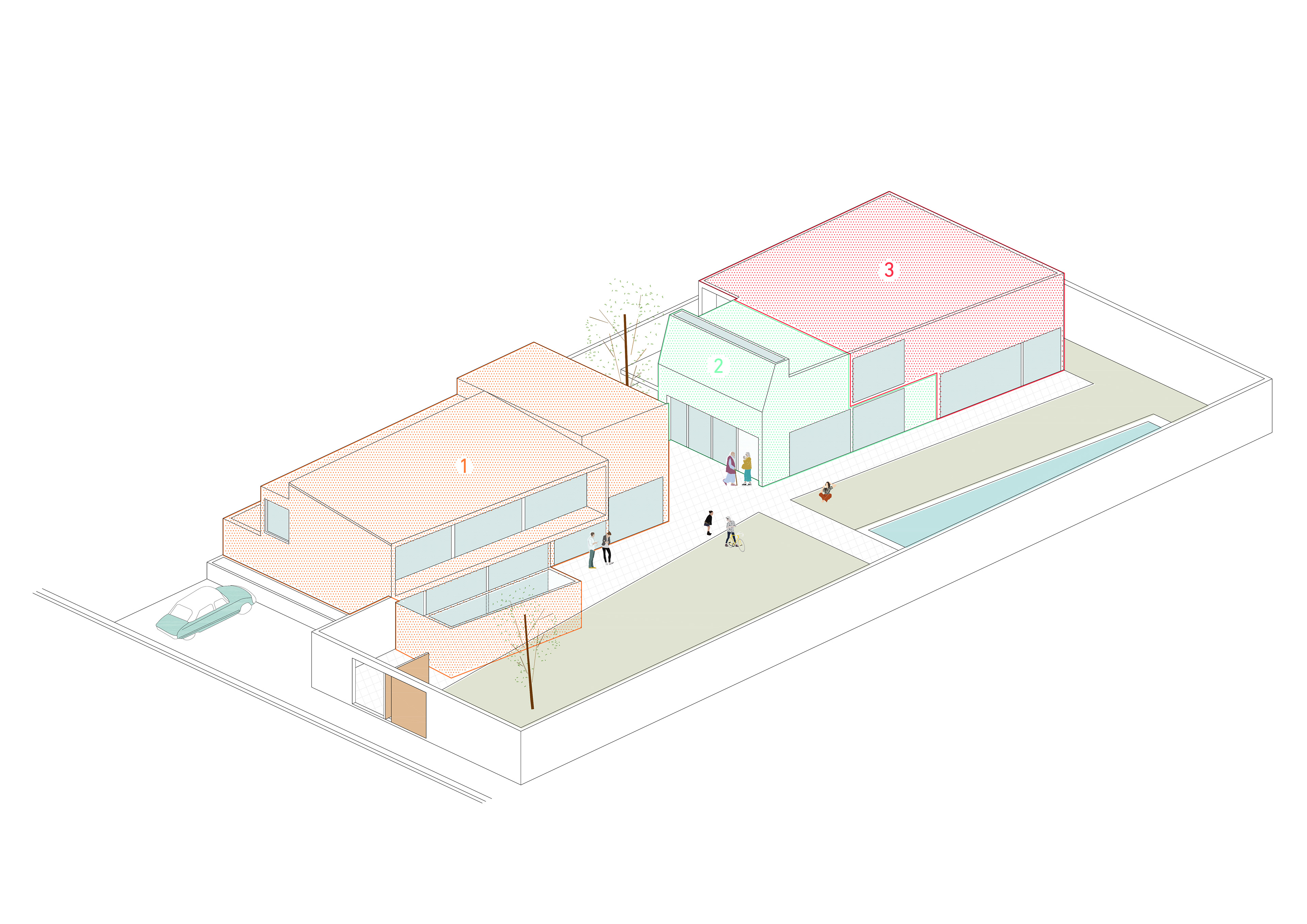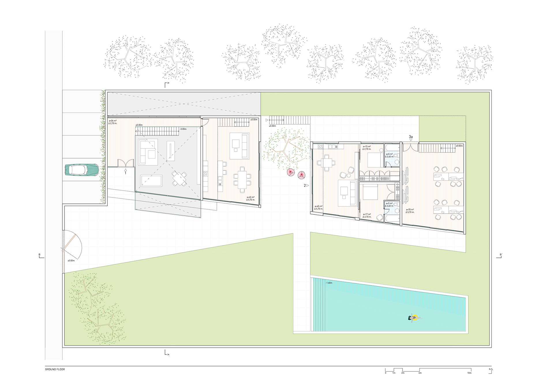 The requirement was to build three houses for a family in a residential area in Madrid. The elderly parents, the film score composer daughter and her husband and children; and the artist son. Instead of building three different volumes for each household, we decided to make a simple gesture to divide the house area and the garden area and develop all the three housings inside this volume.